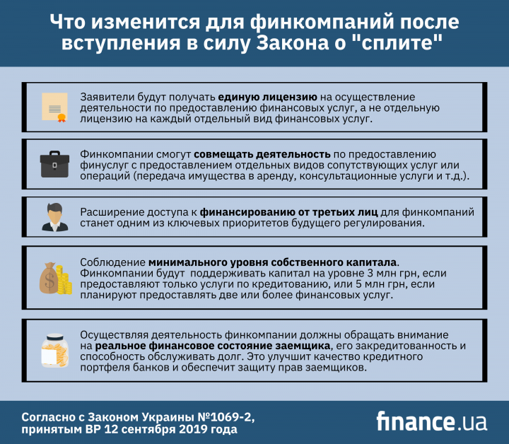 - Президент Владимир Зеленский подписал Закон “О внесении изменений в некоторые законодательные акты Украины относительно усовершенствования функций по государственному регулированию рынков финансовых услуг”, более известный как закон о “сплите”, 16 октября 2019 года.