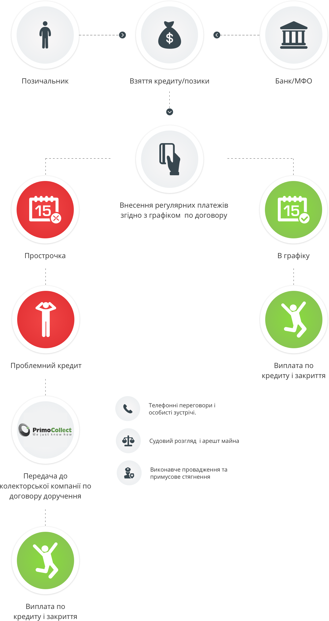 Для забезпечення своїх законних прав, компанія здійснює телефонні дзвінки, надсилає листи, текстові та голосові повідомлення, здійснює виїзди за місцем прописки/проживання/роботи, ініціює процес судового стягнення керуючись ст. 19 Цивільного Кодексу та ст. 3 Цивільно-процесуального Кодексу України.